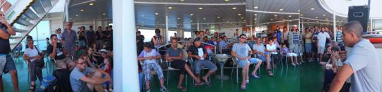 Während das B4P-Boot Oloferne noch in Palermo ankerte, um dann mit der 13-köpfigen Besatzung Richtung Monastir in See zu stechen, hatte die mittlerweile auf über 40 Leute angewachsene transnationale B4P-AktivistInnengruppe zur Überfahrt von Palermo nach Tunis auf den kommerziellen Fähren eingecheckt. Aus Platzgründen musste ein Teil auf eine zweite der hintereinander startenden Fähren ausweichen, aber auf beiden waren sicherlich zu über 90 % tunesische MigrantInnen an Bord, die vor allem von Italien aber auch aus anderen europäischen Ländern zum Urlaub oder Besuch ihrer Familien nach Tunesien fahren.